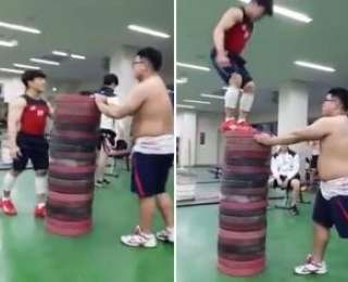 Непонятно, является ли это выполнением упражнения или же ребята просто так развлекаются, но то что они вытворяют, упорно отказывается укладываться в голове. С помощью этой забавы ребята хотели испытать свои способности и посоревноваться друг с другом в том, кто прыгнет с пола выше всех. Для этого они сложили стопку железных блинов и запрыгивали на них по очереди. Победителя так и не удалось выявить, потому как эти ребята, кажется, могут запрыгнуть куда угодно. Больше всех конечно поразил самый низкорослый спортсмен, которому стопка железных блинов доходила до подбородка.