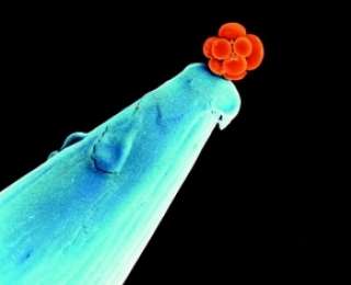 Это морула - человеческий эмбрион в трехдневном возрасте. В таком возрасте эмбрион состоит из 16 клеток и умещается на кончике иглы, именно на ней он и изображен выше.