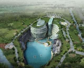 Очевидно, этот нежащийся среди скал и озёр отель — следующий в списке мест для отдыха высокого класса в Китае. Как и горный курорт Даванг, отель «Songjiang» находится в карьере, причём расположенный неподалёку от Шанхая отель будет построен прямо на стенах карьера, а по его фасаду будет стекать водопад. Ну, а если вы не сможете наслаждаться видом с одного из верхних этажей, отправляйтесь в нижние — они будут находиться под водой.