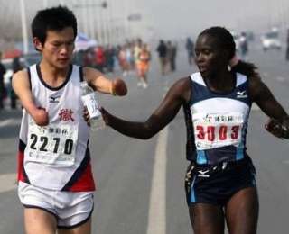6. Жаклин Киплимо помогает бегуну с ограниченными возможностями закончить марафон в Тайване, и это стоило ей первого места