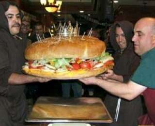 Успех сериала «Человек против пищи» (Man Vs Food) канала «Travel Channel» является доказательством того, что люди любят смотреть на то, как другие объедаются до потери пульса, а также того факта, что существует огромное количество ресторанов и заведений быстрого питания, которые подзадоривают людей кушать больше и мечтать шире. Ниже мы расскажем о самых невероятных примерах блюд, которые заведения питания предлагают съесть на спор. Возможно, некоторые из этих блюд покажутся вам достаточно соблазнительными, чтобы попробовать ответить на вызов этих заведений, если конечно вам присущи большие амбиции и неутолимый аппетит.