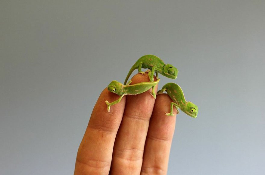 Если вы до сих пор сомневались в том, что рептилии могут быть очаровательными и милыми, то после просмотра этих фотографий вы избавитесь от этих сомнений навсегда! Эта "банда" из более чем 20-ти детёнышей хамелеона, недавно вылупившихся в зоопарке Таронга в Сиднее (Австралия), является самой прелестной группой любопытных исследователей из всех, которых вы когда-либо видели. Эти маленькие зелёные малыши относятся к виду Йеменские хамелеоны, ареалом обитания которых является Йемен и Саудовская Аравия. Хотя они могут менять свои цвета в целях маскировки, на самом деле их цвет меняется гораздо чаще в зависимости от окружающей температуры, во время стресса или в период ухаживания.