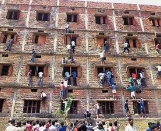 Это родители и родственники школьников, которые пишут выпускные экзамены. Чтобы передать шпаргалки ученикам, их мамы, папы, братья и сестры рискуют собственной жизнью. Например, здесь шпаргалки передают 10-классникам в школе штата Бихар во время написания тестов.