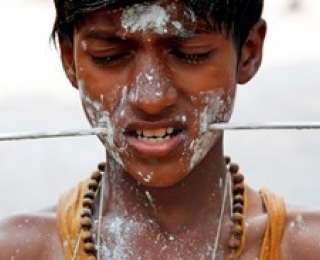 Индийский верующий в рамках религиозного ритуала пронзил свои щеки металлическим трезубцем. Он участвует в религиозной процессии к храму индусской богини Мутхумаримман в Мумбаи, Индия, 28 марта 2015 г. Верующие совершают обряд после молитв богине в надежде быть услышанными богами.
