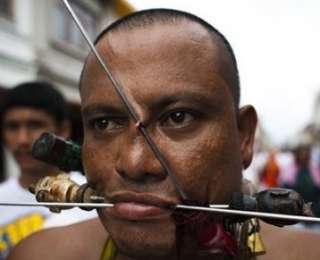 На ежегодном Вегетарианском фестивале в Пхукете в Таиланде, участники исполняют один из самых мазохистских и радикальных ритуалов: они протыкают свои щеки копьями, ножами, крюками и мечами. Считается, что в это время боги входят в тело, защищая человека ото зла и привлекая удачу.