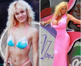 Слева - фото 1990 г. после первого увеличения груди, справа - после 13-й операции. До первой операции она работала официанткой, а после переехала в Лас Вегас и устроилась на работу танцовщицей.