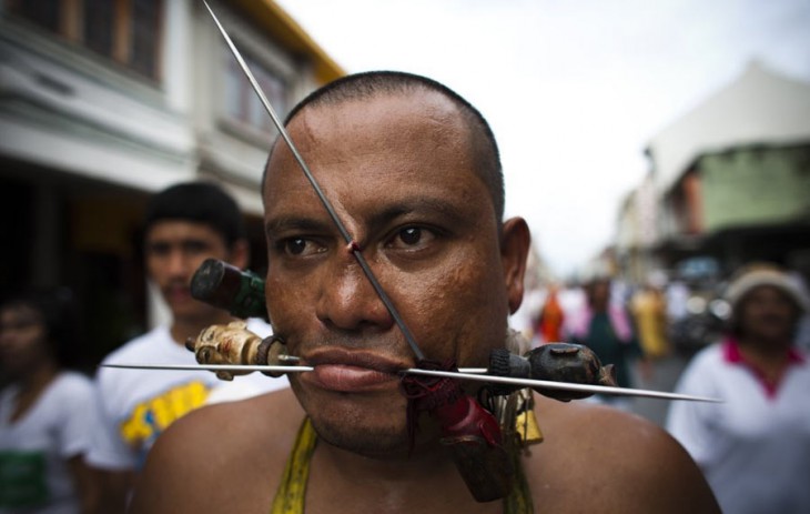 9. На ежегодном Вегетарианском фестивале в Пхукете в Таиланде участники протыкают свои щеки копьями, ножами, крюками и мечами.