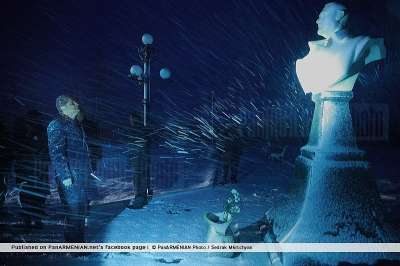Я сделал это фото пару дней назад: премьер министр Тигран Саргсян у памятника Вагена Саргсяна возле дома-музея. В тот момент, когда Армению охватила снежная буря.