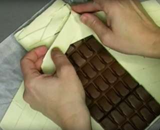 Постели на рабочую поверхность бумагу для запекания, а на нее - слоеное тесто. Положи плитку шоколада точно в середину слоеного пласта, как показано на картинке.