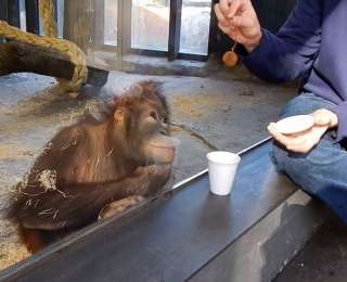 Молодая пара пришла в зоопарк, где решила показать фокус скучающему орангутангу и посмотреть на его реакцию. На глазах орангутанга парень положил в белый стакан какой-то предмет, похожий на фрукт, и потряс его. Во время манипуляций со стаканом фокусник смог незаметно выкинуть из стакана предмет, после чего открыл и показал своему невнимательному зрителю, что стакан пустой. Далее последовала милейшая реакция животного, которую вы просто обязаны увидеть.