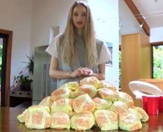 Помните, мы уже писали вам о жутко голодной новозеландской модели по имени Нела Зиссер(Nela Zisser), которая разрушила все наши укоренившиеся стереотипы о моделях? Она не ест по одному огурчику в день, а поглощает пищу в гигантских масштабах. Зачем она это делает? Просто Нела азартная девушка, которая регулярно принимает участие в конкурсах по скоростному поеданию. В прошлый раз на наших глазах она съела 9 полутораметровых сэндвичей за 9 минут и наверняка осталась голодной. На этот раз девушка решила побить действующий мировой рекорд японки Юку Киношиту, которая за раз смогла съесть 62 чизбургера. К сожалению, девушка не смогла побить рекорд, но осилила 45 чизбургеров за два часа, которые составляют больше 13 000 калорий!