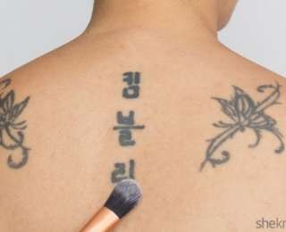 Круглой плоской кистью наносим плотный слой любимой тональной основы, покрывая область вокруг татуировки в том числе. Растушевываем границы.