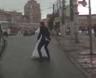 На кадрах видно, что из белого автомобиля, перевозившего жениха с невестой, выбежала девушка в свадебном платье. Следом за ней машину покинул молодой человек, одетый в костюм.