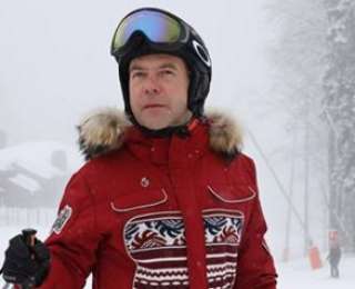 Модные промахи Медведева уже никого не удивляют. Вот его красная курточка под хохлому. В таком "мужественном" виде он и катается на лыжах "А теперь сними меня вот так"
