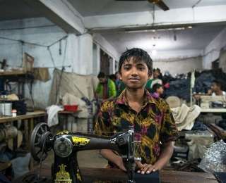 Основная обязанность этого мальчугана заключается в пришивании ярлычков с наименованием бренда к джинсам.
