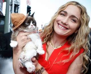 Это -- знаменитый сердитый котик, известный в миру как Grumpy Cat. Сидит на руках у своей владелицы.