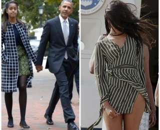 Мишель Обама вместе с дочерью Малией прилетела в Испанию. Но Мадрид встретил их сильным ветром, к чему обе были не готовы. Мишель была одета в струящееся платье, которое мгновенно отреагировало на порывы ветра и чуть было не оголило первую леди США. А вот Малии справиться с ветром едва ли удалось. Девушка появилась на трапе самолета в коротком платье с запахом, а уложенной прическе она предпочла распущенные волосы. В итоге девушка решила не обращать внимания на локоны, закрывшие лицо, и придерживала коротенькую юбочку, которая все-таки оголила бедра девушки.