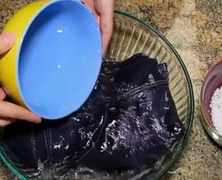 На джинсы в тазике выливаем чашку воды, а затем высыпаем чашку соли, которая поможет сохранить изначальный цвет.