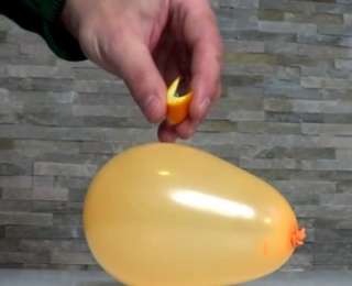 Опыт: Отрежьте от апельсина кусочек кожуры, как если бы вы чистили апельсин для еды. Надавив на кожуру, брызните соком цедры на надутый шарик. Шарик лопнет.