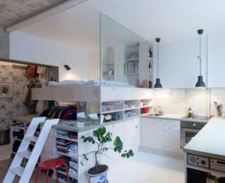 Архитектор Карин Мац из Стокгольма превратила помещение площадью 36 квадратных метров из склада современную квартиру-студию. На половине этого пространства девушка уместила кухню спальню и гардероб. Работа над второй половиной жилья пока еще не завершена, но здесь Карин обустроит уютную зону отдыха.