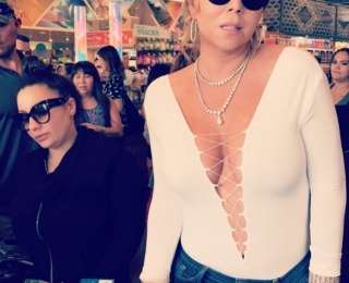 Для похода в магазин Мэрайя выбрала синие джинсы и откровенную блузу-сетку, продемонстрировав обнаженную грудь.