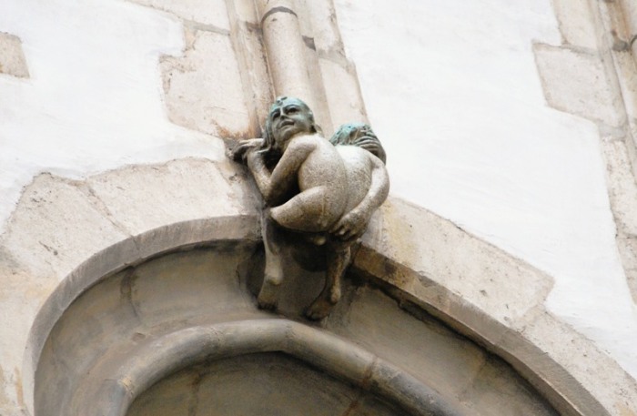 Согласно другому мнению, голый человечек – всего лишь разновидность горгулий, которыми часто украшали стены готических храмов.