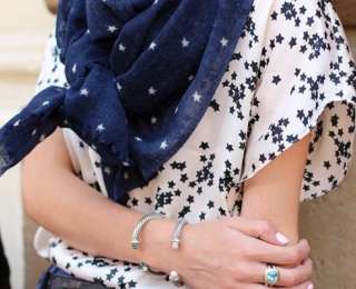 Возьмите шелковый или шерстяной платок среднего размера с ярким принтом. Сложите его по диагонали, поместите на плечах традиционно уголком сзади, кончики сложите на груди. Зафиксируйте кончики декоративной булавкой или брошью посередине. Также можно взять кольцо и пропустить через него оба кончика, выпуская ткань в виде банта.