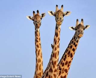 Фотографу удалось запечатлеть родезийских жирафов в момент, когда один из них стоит перед двумя другими. При этом все животные вытягивают шеи таким образом, что создается впечатление одного существа.