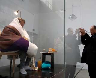 Для того, чтобы Абраам высидел куриные яйца, мужчину поместили в стеклянном виварии в парижском музее Palais de Tokyo, где на него будут смотреть посетители.