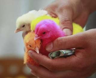 Разноцветные цыплята теперь выращиваются на фермах, а выставляются на продажу прямо на оживленных городских улицах.