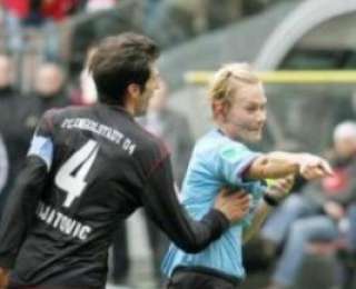 Женщина-арбитр из Германии Бибиана Штейнхауз снова попала в пикантную ситуацию, подставив футболисту свою грудь..