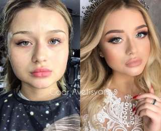 А это прекрасная Валерия и очередная,самая любимая рубрика "до и после макияжа", демонстрация для студентов , тема " Американская невеста ", который входит во 2 ступень обучения у меня . Этот стиль макияжа обязательно включает в себя мощную стрелку и густые ресницы, а так же сияющий тинт или пигмент на подвижном веке, терракотовая гамма оттенков теней , стойкая кремовая коррекция лица и нюдовые губы,как вам???