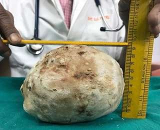 Во время полуторачасовой операции индийские хирурги извлекли из мочевого пузыря 49-летнего Махешбая Расикбай Патель, который жаловался на мучительные боли, огромный камень размером 11,5 см на 17 см и весом 1,4 кг.
