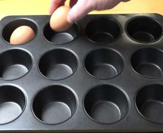 - Возьмите форму для кексов. В каждую ячейку формы поместите яйцо в скорлупе. Они должны быть комнатной температуры, если вы только достали их из холодильника, дайте им 15 минут чтобы немного нагреться.