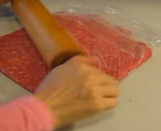 В пакет поместите фарш, заполнив половину пространства. Скалкой пройдитесь по пакету, сформировав пласт. Палочкой для суши либо любым другим приспособлением (например, плоским шампуром или тупой частью ножа) немного придавите фарш, формируя сетку из порционных кусочков. После заморозки они будут легко отламываться.