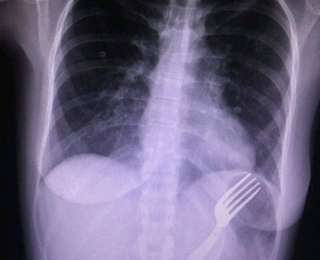 Коллекция рентгеновских снимков с обнаруженными внутри пациентов предметами пополнилась еще одним. Так, врач из Курска разместил в своем твиттере фото вилки, неизвестно каким образом оказавшейся во внутренностях женщины.