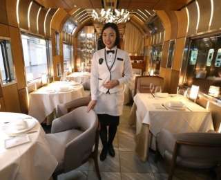 Состав из десяти вагонов может похвастаться шестью двухэтажными люкс-купе с туалетом и ванной, вагоном-рестораном с живой музыкой, баром и двумя зонами отдыха с панорамными окнами.
