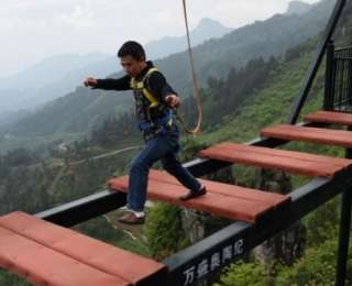 К первомаю в живописном районе города Чунцин, Китай, открыли новый мост, который выглядит весьма пугающе - доски расположены на большом расстоянии друг от друга, и складывается ощущение, что человек либо перепрыгнет от одной перекладины к другой, либо, в случае неудачи, сорвется в бездну.
