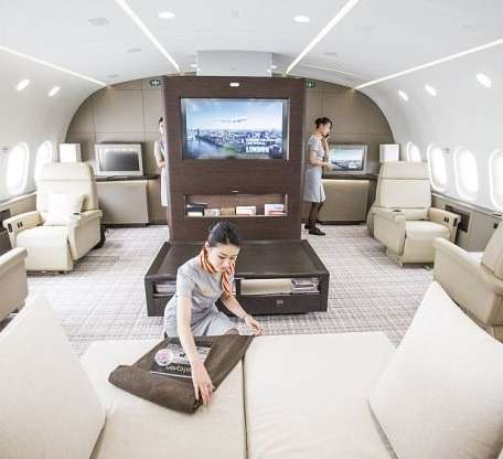 Встречайте самый большой в мире частный самолет Dreamliner B787 Dreamjet, построенный на базе авиалайнера Boeing 787 Dreamliner. В то время как обычный самолет может вмещать минимум 240 пассажиров, это воздушное судно рассчитано лишь на 30 человек. Счастливчики, летящие этим самолетом, будут окружены максимальным комфортом и роскошью, сопоставимой с дорогими пентхаусами. Помимо большого зала, где можно проводить конференции и спокойно отдыхать во время полета, на борту также есть несколько спальных комнат и даже ванные. Стоимость самолета составляет почти 300 миллионов долларов, а его аренда обойдет в 26 тысяч долларов в час.