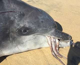 Несмотря на то, что дельфины очень умные существа, иногда они заглатывают больше, чем могут пережевать. Это произошло с дельфином, найденным мертвым на пляже Стратхем у портового города Банбери в Западной Австралии. При вскрытии выяснилось, что млекопитающее попыталось проглотить осьминога весом 2,1 кг, когда щупальца "ужина" перекрыли его дыхательные пути.