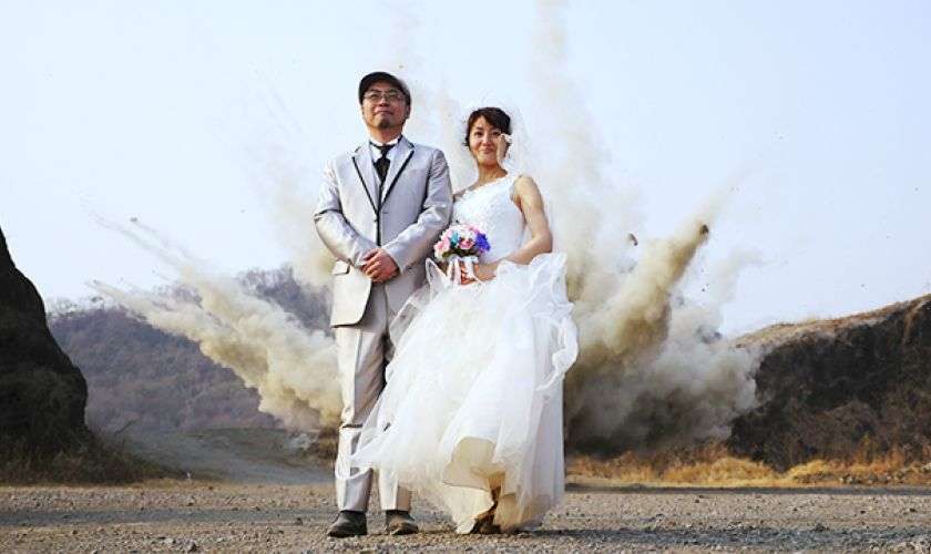 Молодожены из Японии решили отличаться, и поучаствовали в свадебной фотосессии с использованием взрывоопасных и пиротехнических средств.