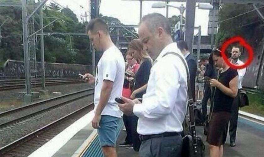 Посмотрите на всех людей, запечатленных на снимке. Они все до единого уткнулись в свои гаджеты и, кажется, не поднимают головы. Человек, обведенный в кружок, явно выбивается из толпы. Куда он смотрит? На мир? Как это необычно в 21 веке!