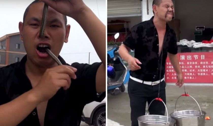 Так, мужчина продел хвост живой гадюки через ноздрю и вытащил его изо рта. Кроме того, Сун показал, как переносить вёдра с водой, прицепив их металлическими крюками к векам. Всем своим способностям мужчина обучил и своего сына.
