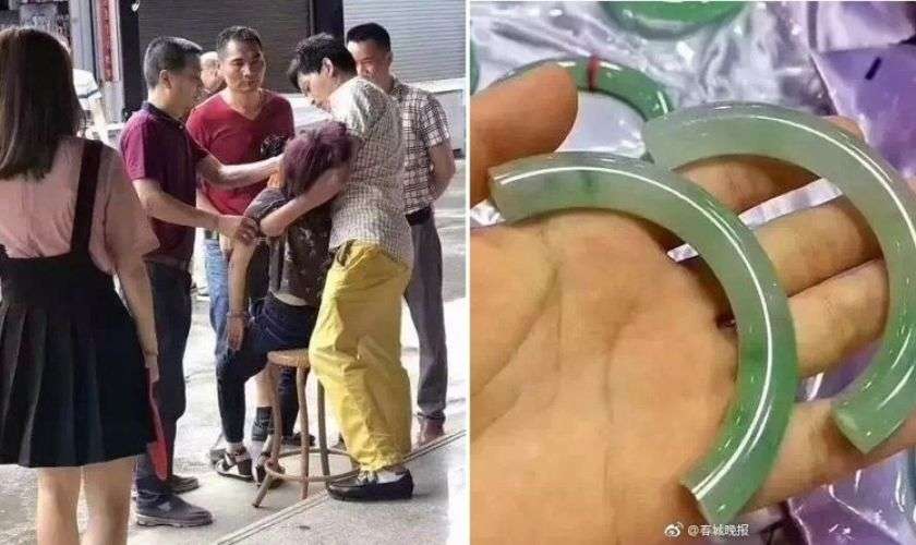 Происшествие произошло на нефритовом рынке в городе Жуйли, провинция Юньнань, Китай. Женщина пыталась примерить браслет, когда он случайно выскользнул из руки, упал на пол и разбился пополам.
