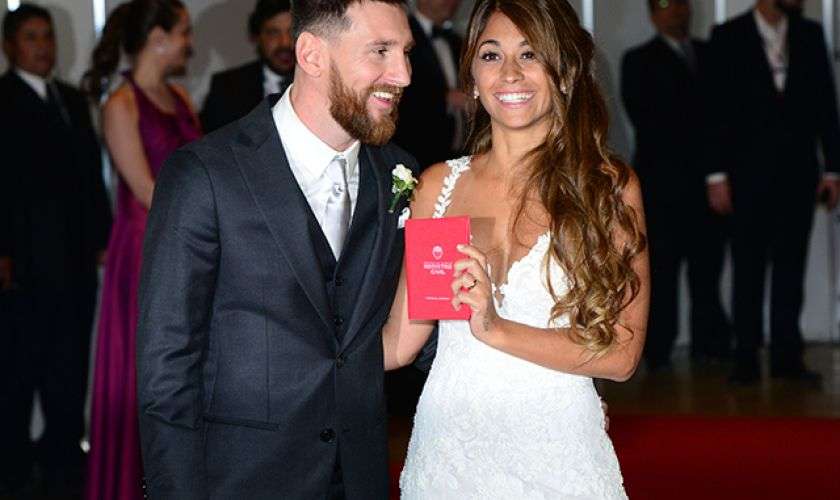 Лионель Месси и Антонелла Рокуццо позируют фотографам в день своей свадьбы
