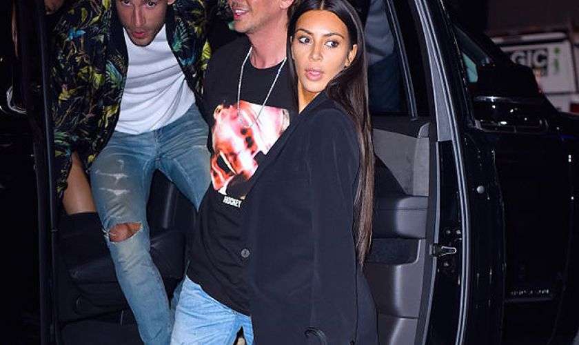 Для ночной вылазки Ким переоделась, сменив топ на полупрозрачное бра от Gucci, а велосипедки — на бархатные облегающие короткие лосины. Если приглядеться, можно заметить новый жакет, а также маленькую сумку от Prada.