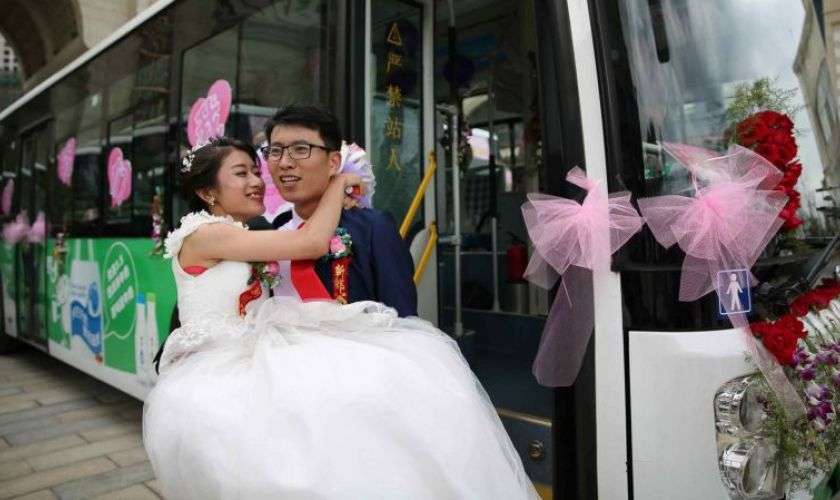 По традиции, в день свадьбы жених увозит невесту на машине, но пара из китайского города Циндао поступила с точностью до наоборот. Невеста - водитель общественного транспорта Ву Чжэн - заехала за своим избранником на автобусе, в салоне которого они познакомились.