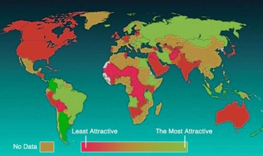 Самые красивые женщины мира. Зеленый цвет — самые красивые, красный — самые некрасивые.