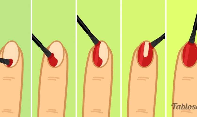 Чтобы лак ложился равномерно и не стекал по краям, начинайте с середины. Действуйте так: поставьте точку у кутикулы и растяните ее по обе стороны ногтевой пластины, закрасьте центр, “запечатайте” кончик.