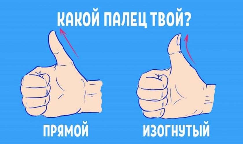 У каждого человека есть сильные и слабые пальцы. Ровный, стремящийся вверх — сильный палец. Изогнутый, слегка отклоняющийся к другому пальцу — слабый. Сильный большой палец говорит о стремлении к профессиональному успеху.